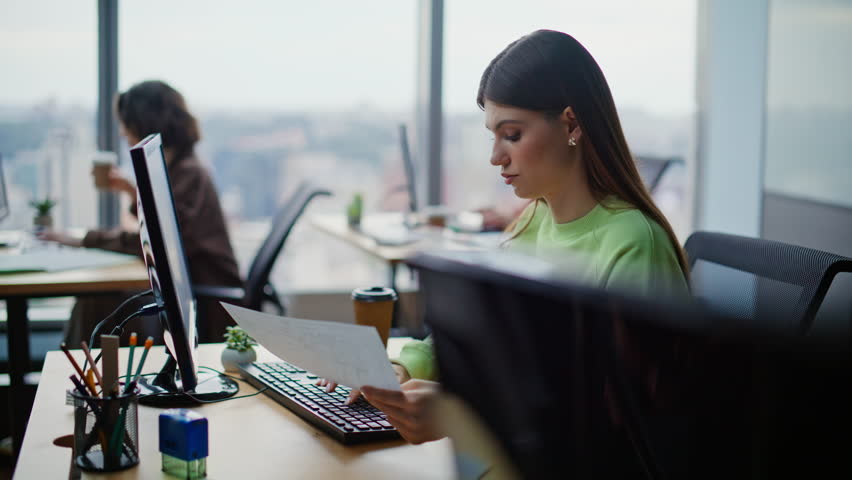 Young creative specialists working on joint project developing strategies in modern bright agency. Focused coworker woman entering data. Busy students learning subject. Motivated team members at job