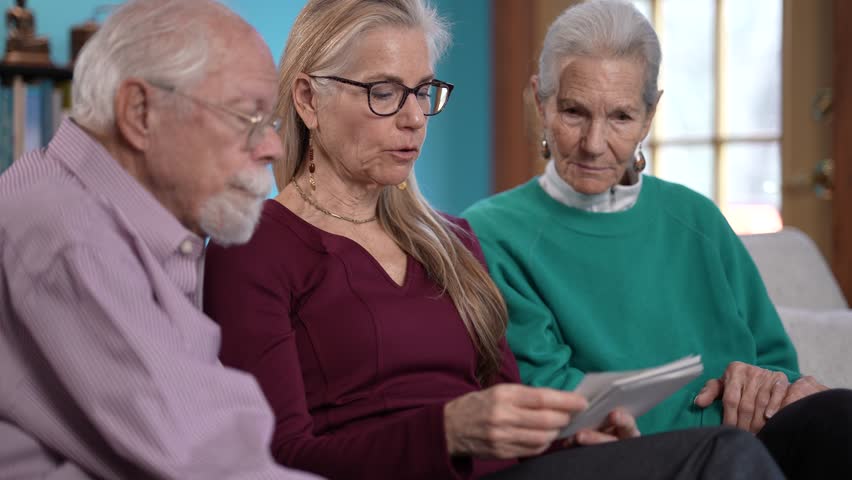 Three family members, including elderly parents and their adult child, gather in a inviting living room, sharing moments together and discussing old photos and memories.
